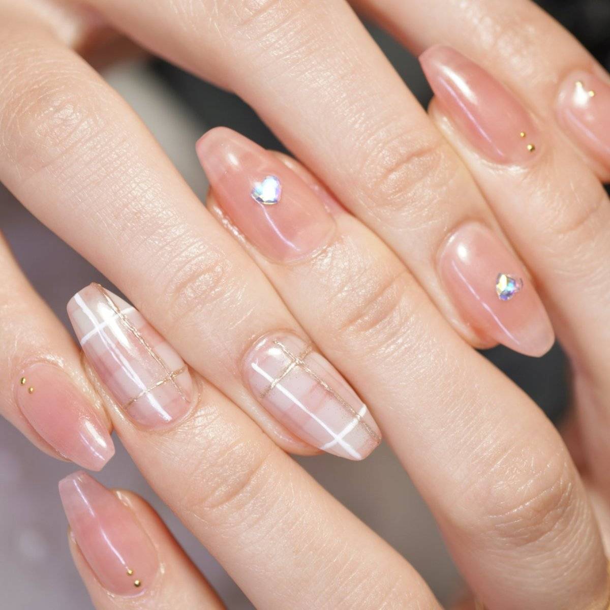 2025〜2026年の冬は、チェック柄が引き立つように、他の爪はシアーなピーチピンクで仕上げると良いでしょう。