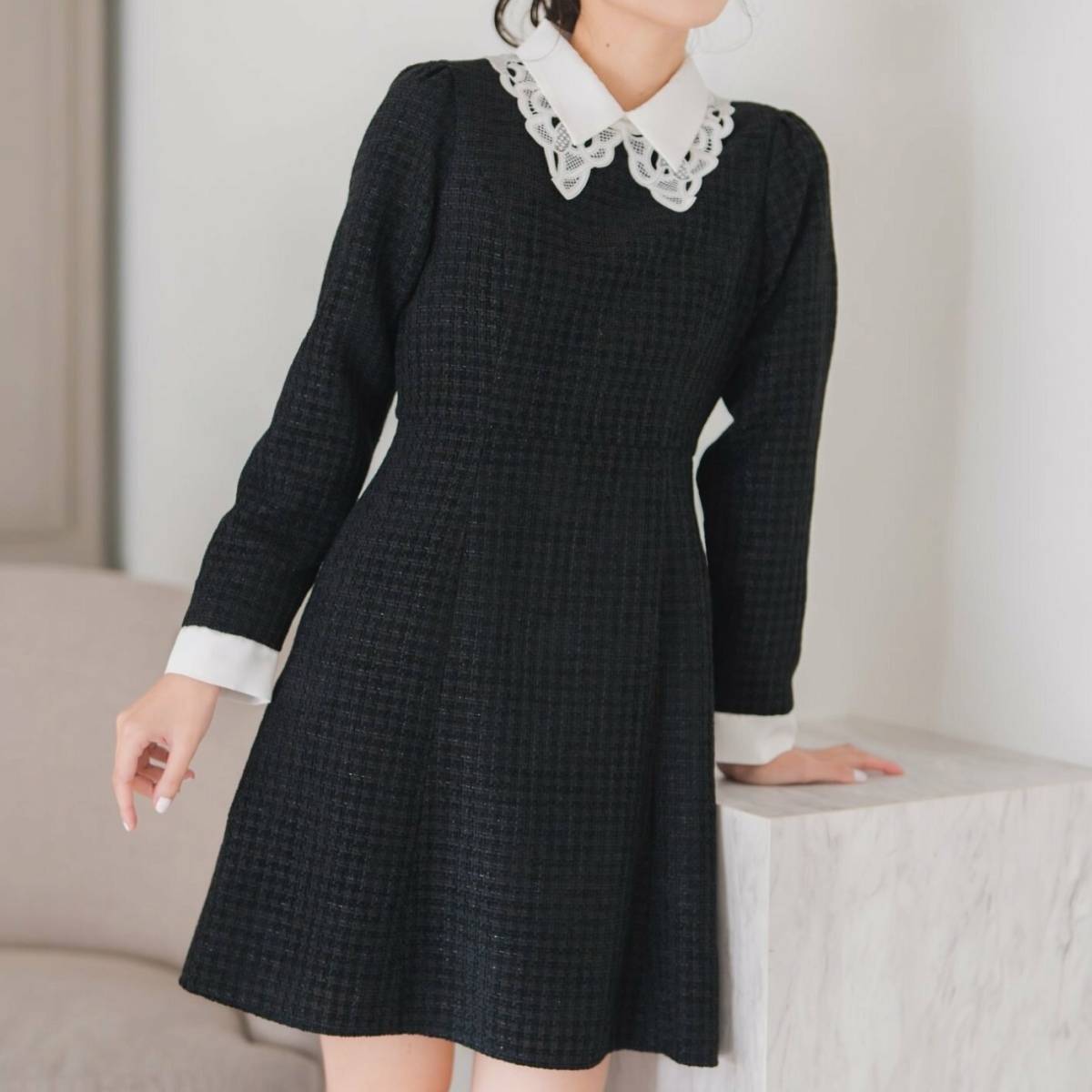レースの襟がレディライクな雰囲気のワンピースは、大人女子が2026年冬に着るのにぴったり♪