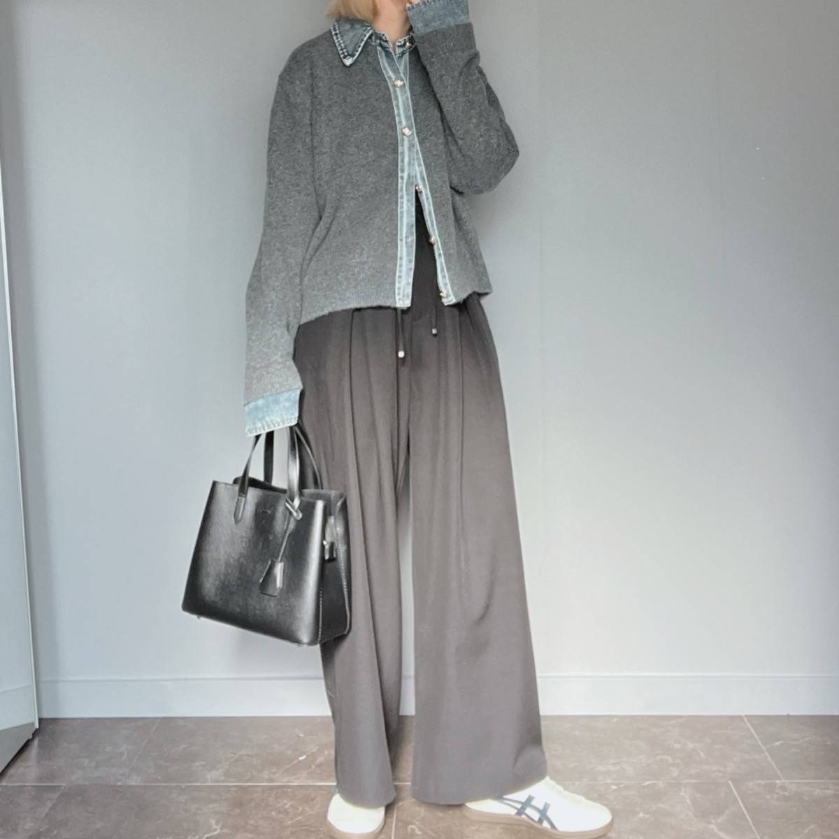 襟付きカーディガンに、ウエストをドロストして穿けるワイドパンツを合わせてリラックス感を出してみて。