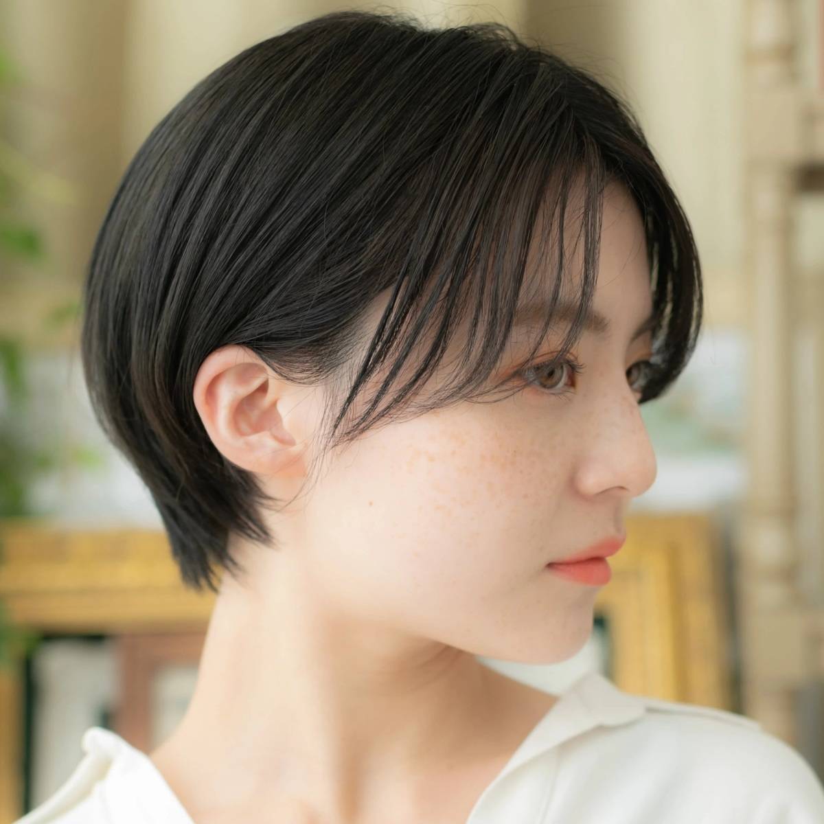 ひし形シルエットのショートヘアスタイルは、小顔見えするところがGOOD。