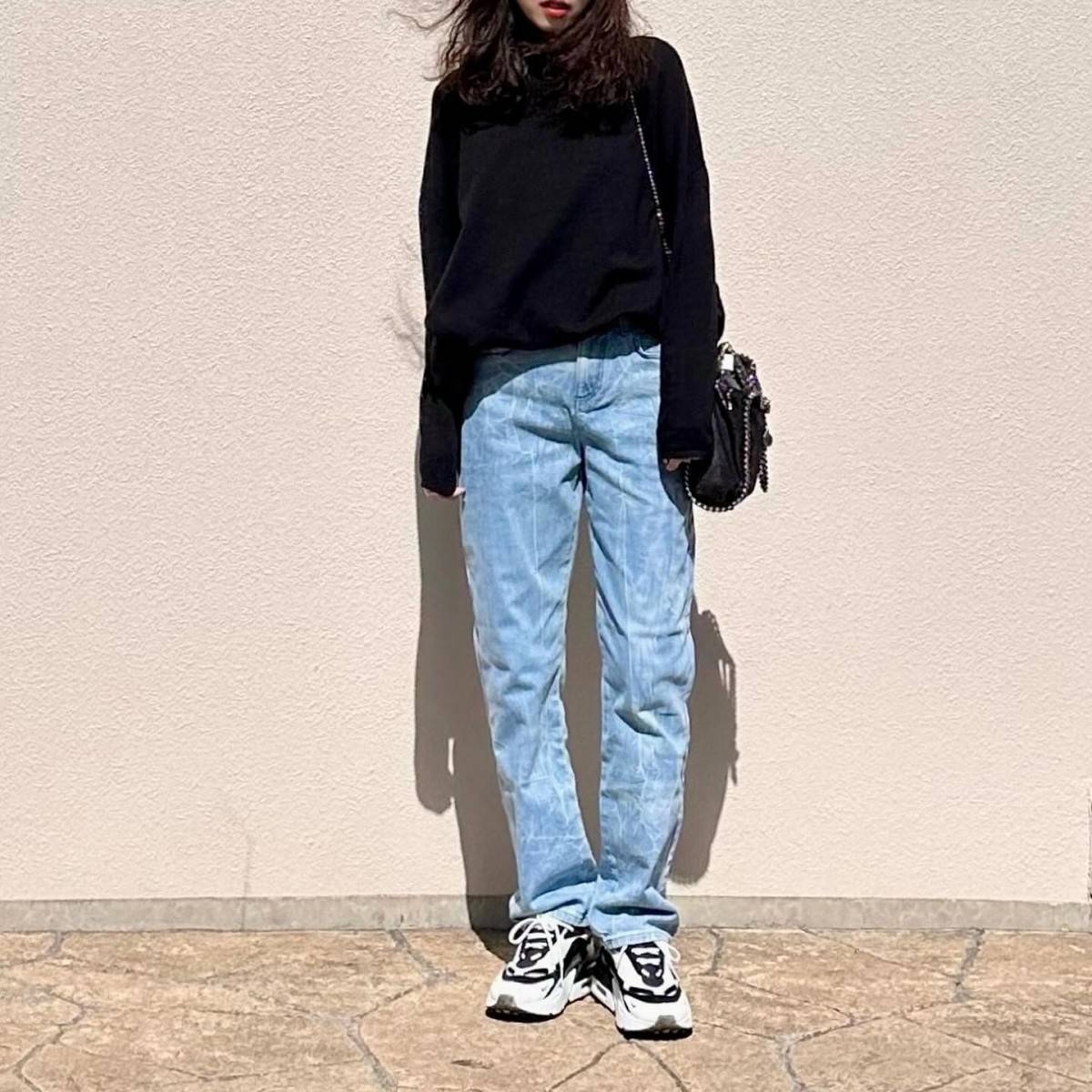 黒のタートルネックニットにデニムパンツを合わせたら、足元はスニーカーを選ぶと◎