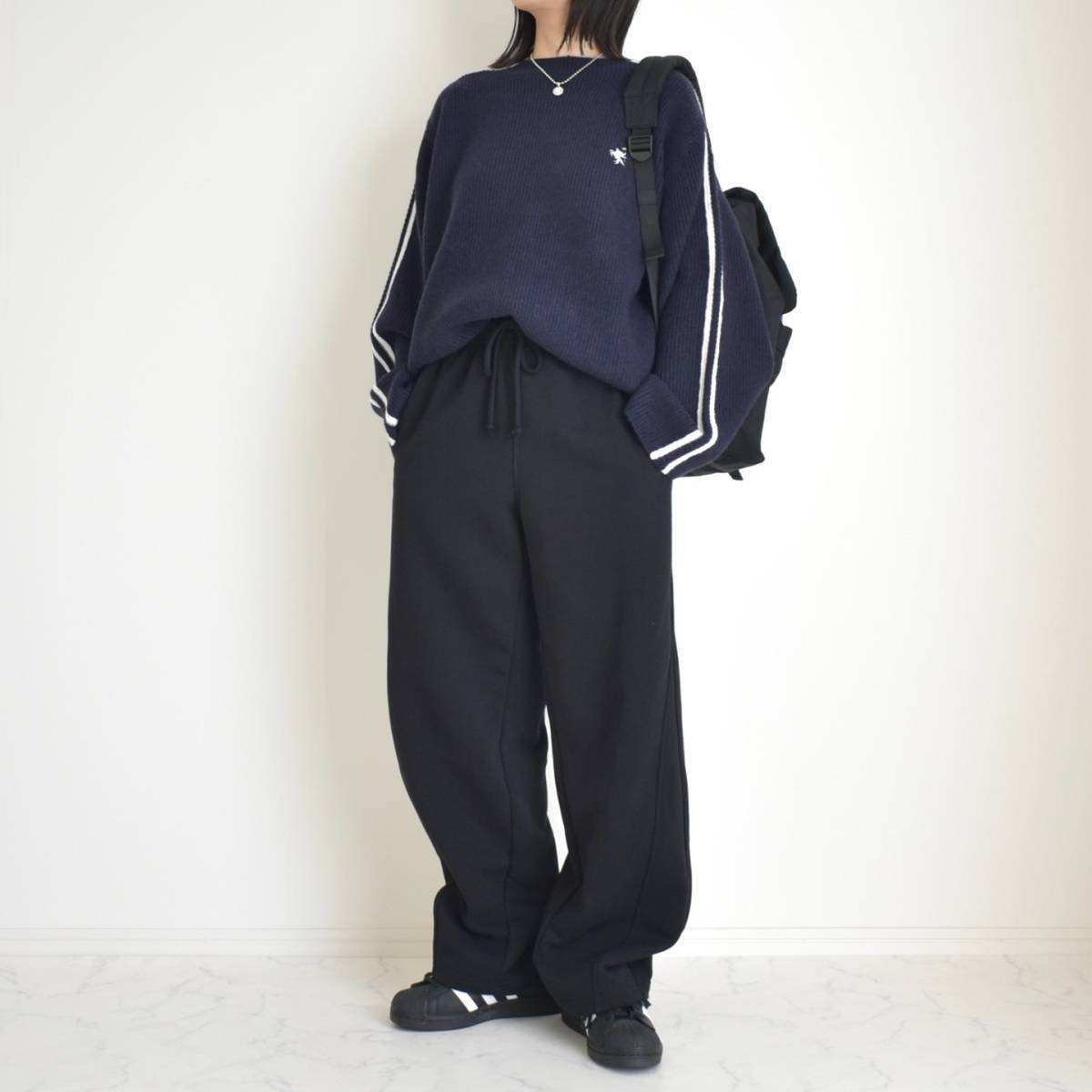ネイビーのトップスに黒のワイドパンツを合わせた濃色コーデは大人っぽいのですが、一方で重たく見えてしまうことも……。