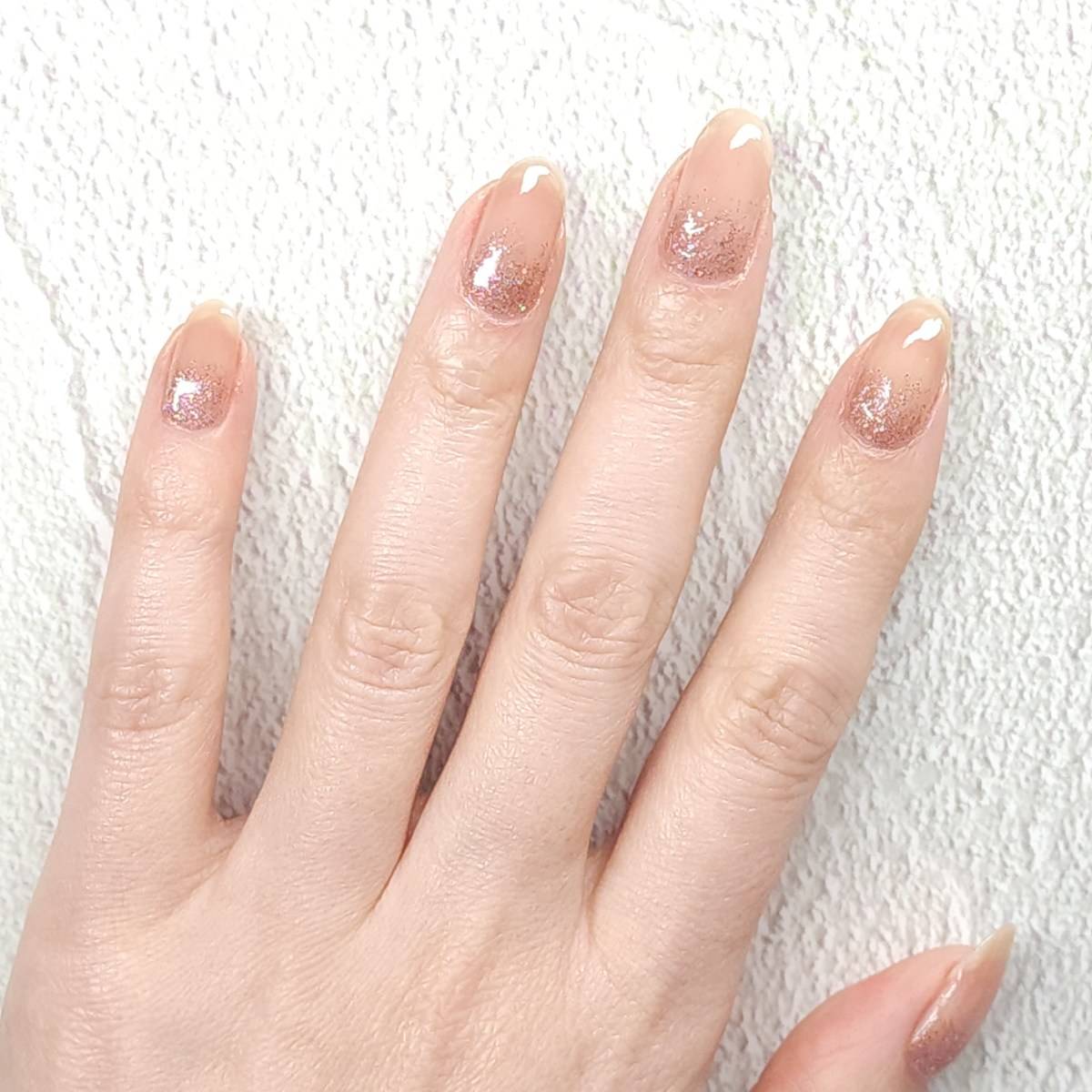 実は、ラメを爪先に置くと印象が強くなりますが、根元に置くことで視線をコントロールできて一気に垢抜けるんです。