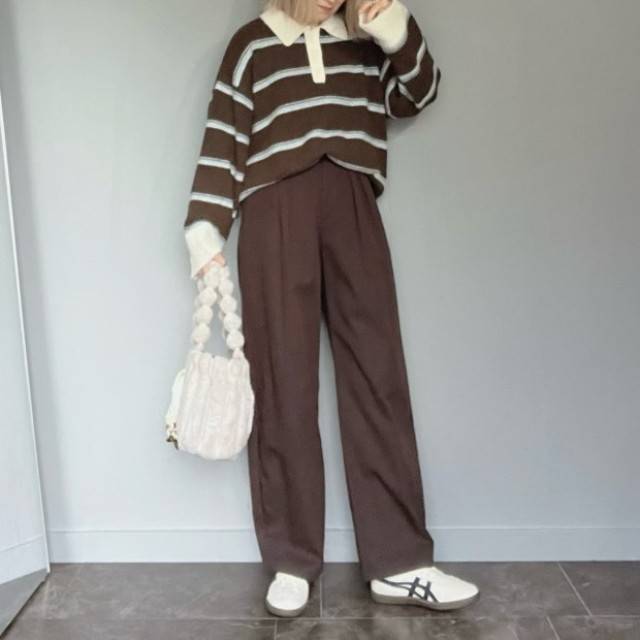 トップスもボトムスもブラウンを選んだワントーンコーデのときは、効果的に白を使ってみて!