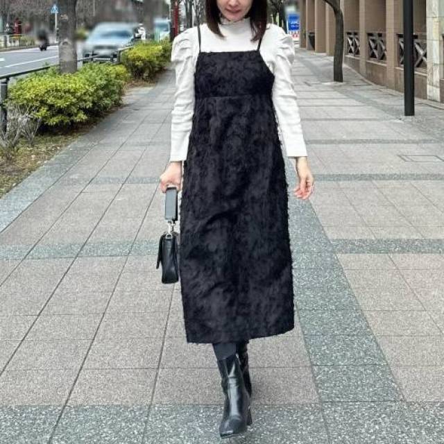 シャギー素材が目を引く黒のキャミワンピースは、フェミニンな印象でおしゃれ♡