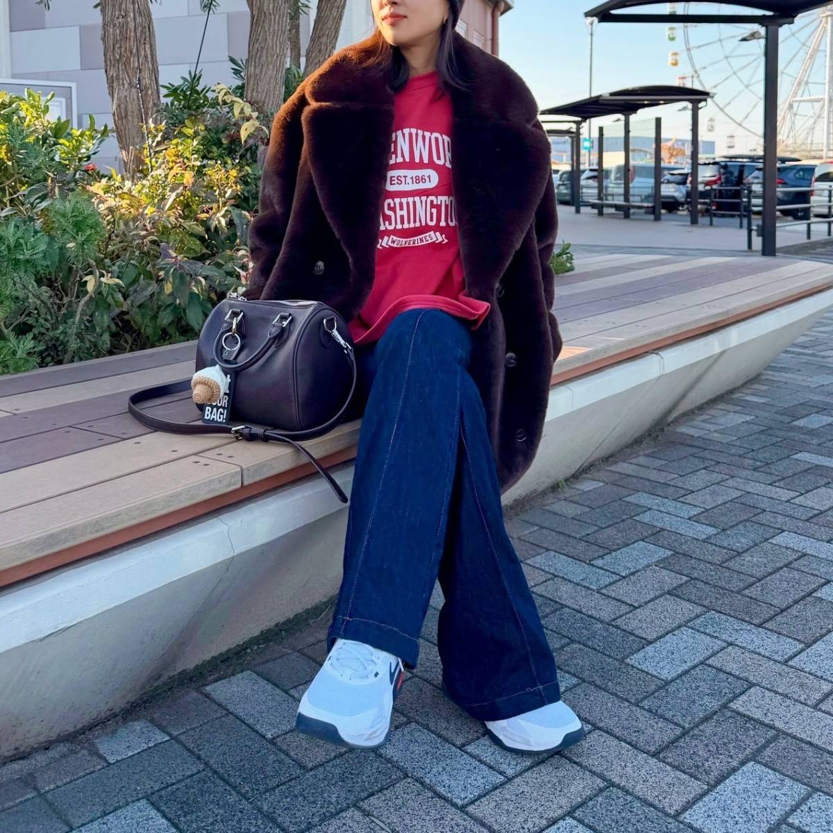 【真冬編】垢抜けるデニムパンツコーデ⑤カラースウェット×ファーコート