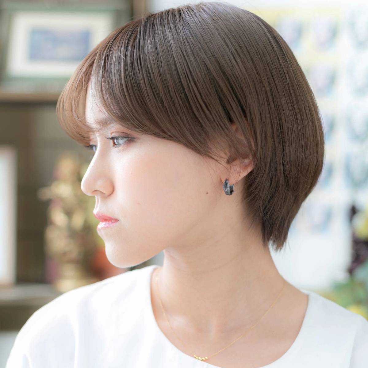 イヤリングカラーを入れると、顔まわりがぱっと明るい印象に♡
