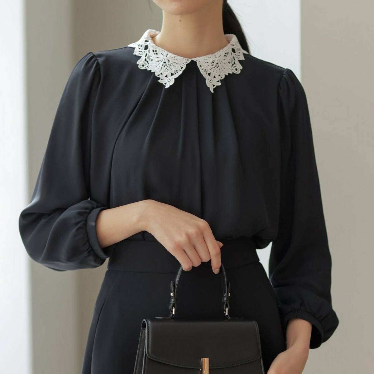 レース襟で顔まわりを明るく華やかに見せてくれるブラウストップス。