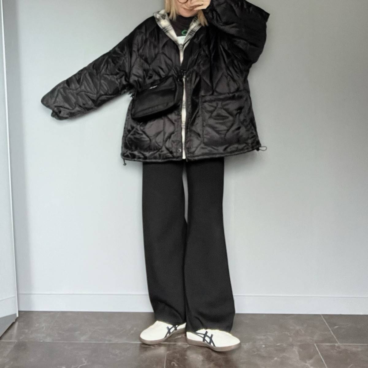 【真冬編】センスいい黒パンツコーデ⑤チェック柄のシャツをチラ見せする♡