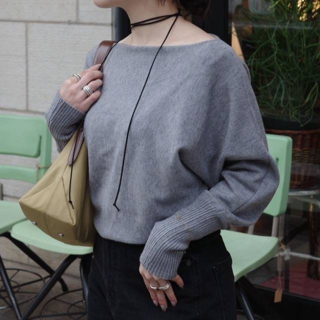 肩を優しく見せるオフショルダーがデコルテを美しく演出し、ドルマンのゆるやかな袖が動きにニュアンスを添えます✨