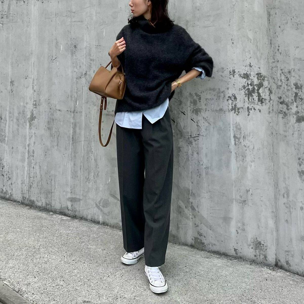 ニットの裾から重ね着したシャツをチラ見せすると、一気に垢抜けた印象に♡