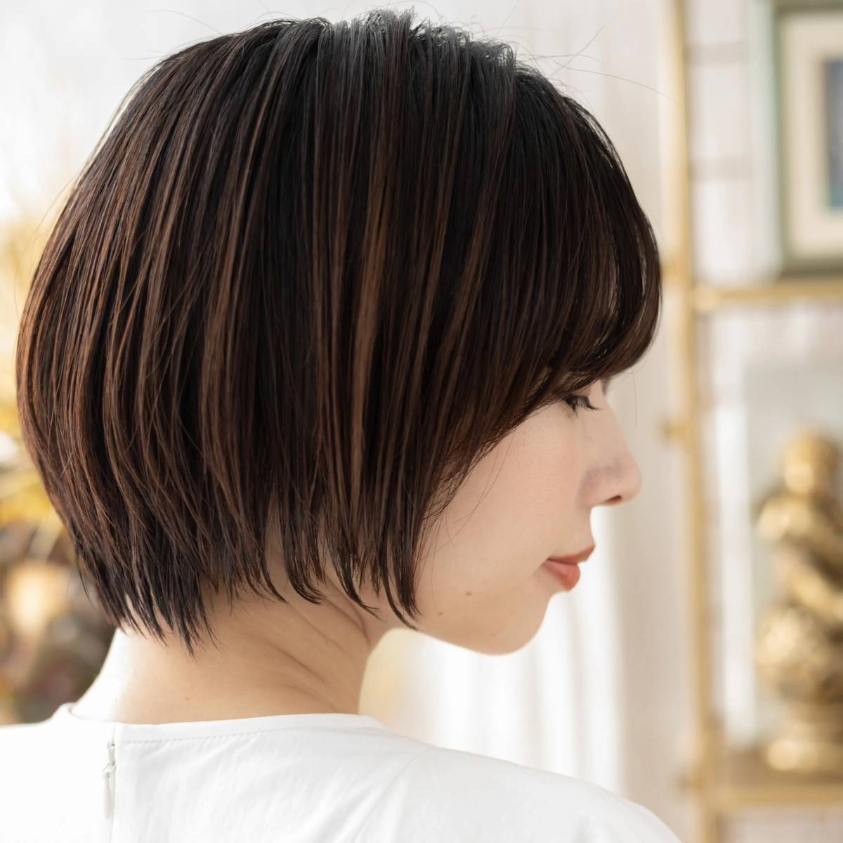 自然な丸みのあるマッシュベースのショートは、若々しく見える髪型で大人女子に◎
