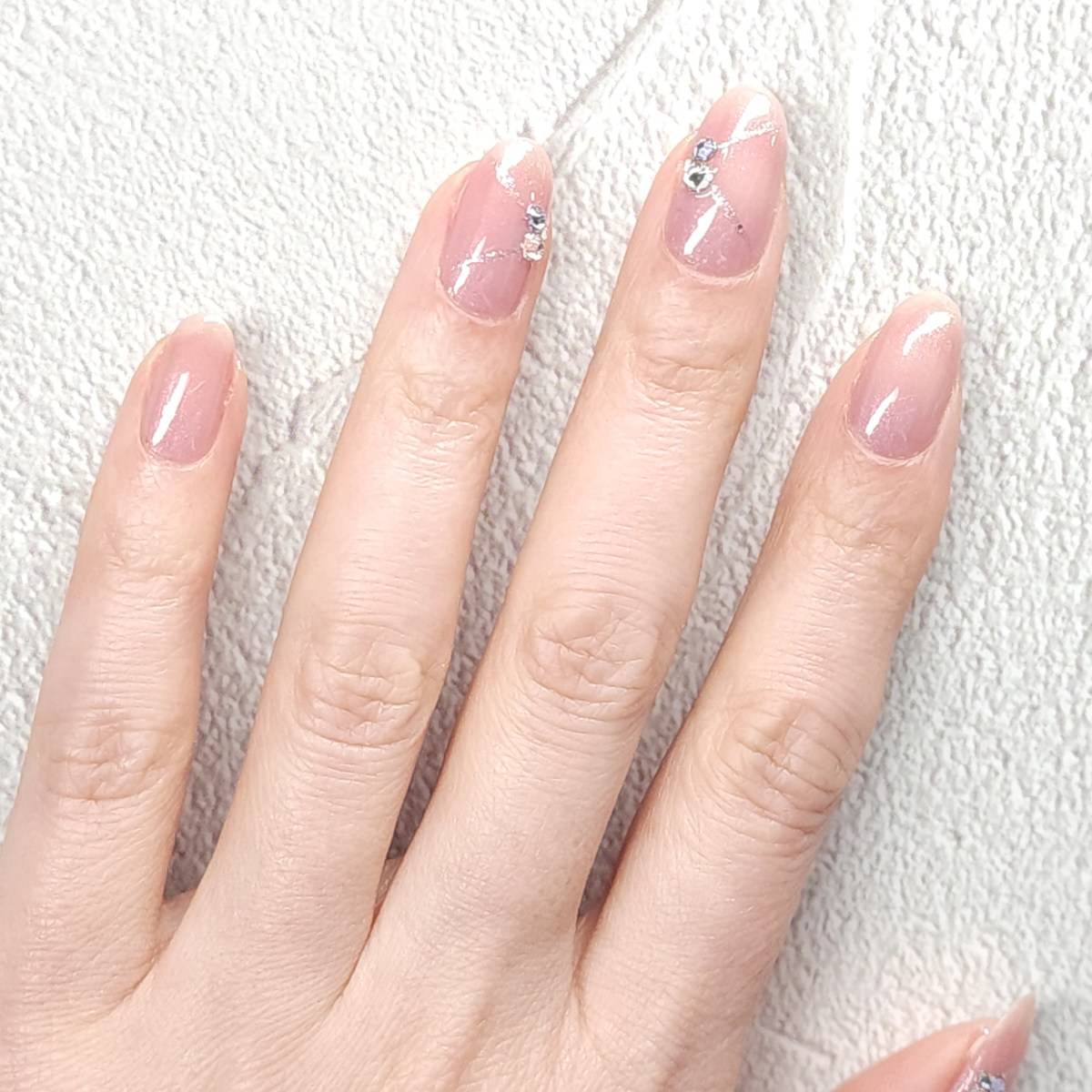 1度塗りでほんのり血色感のあるカラーに、ラメラインとネイルストーンを添えた「ラベンダーピンクネイル」の完成です。