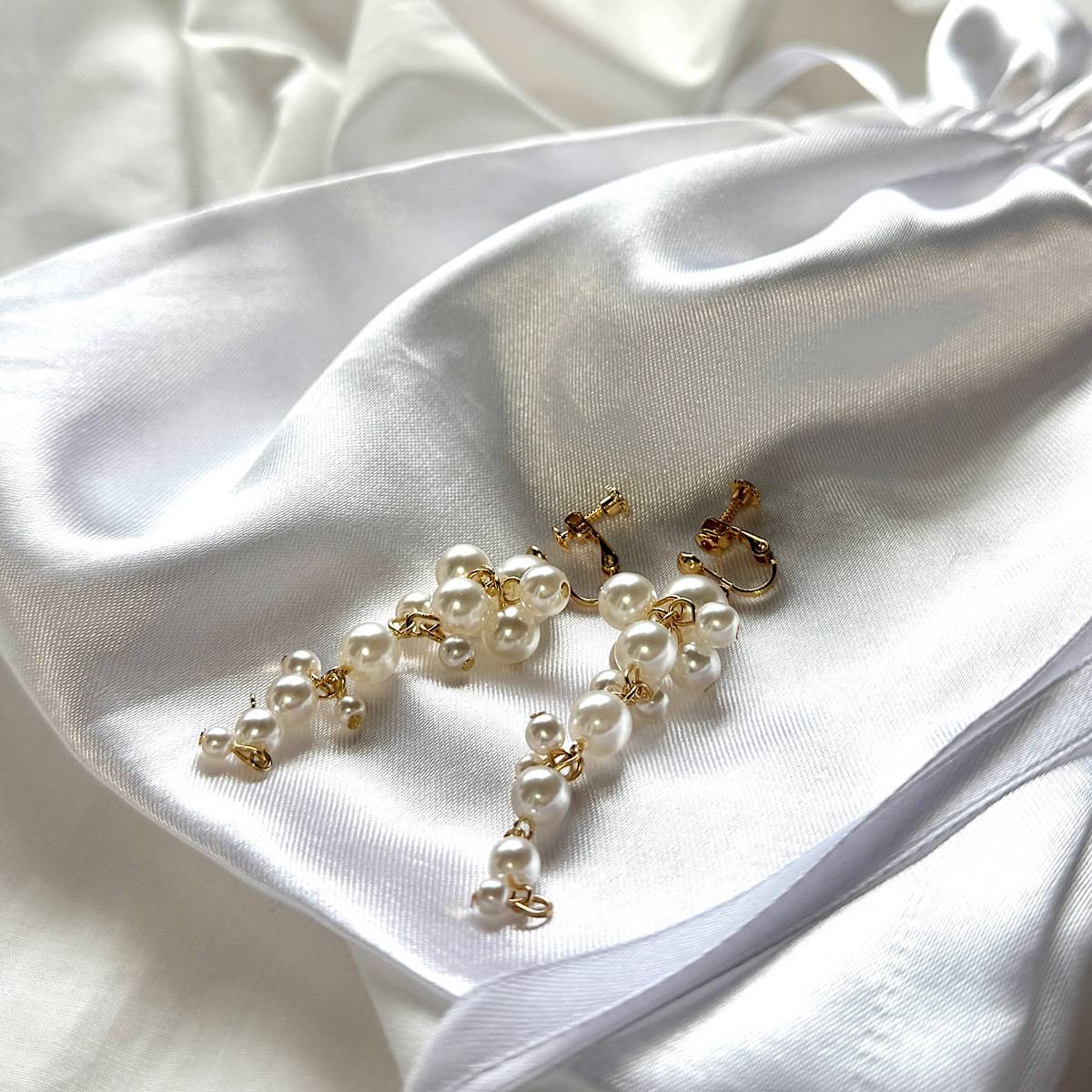 上から下へ大きさの異なるパールビーズが連なり、動くたびに軽やかに揺れる絶妙なバランス。