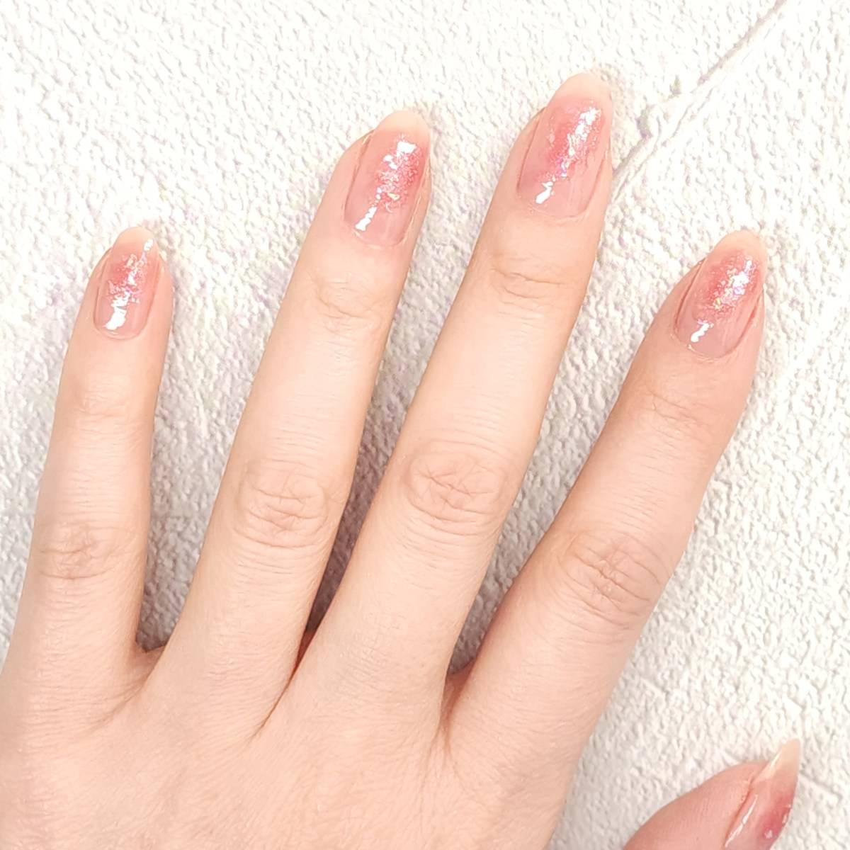淡いピンクのベースカラーに、ジュワッと血色感が大人可愛い「チークネイル」の完成です。