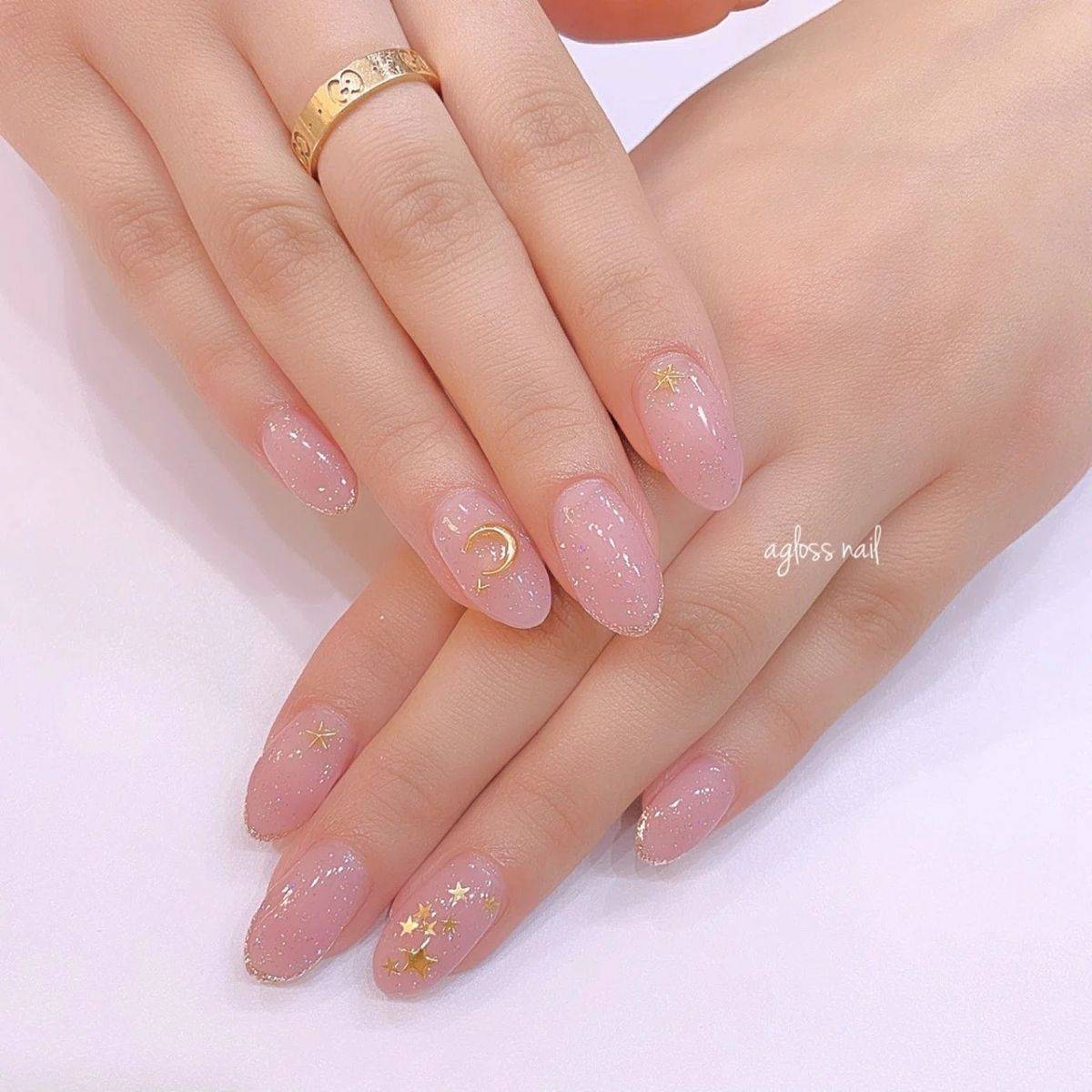 モーヴピンクに繊細なラメをプラスしたネイルなら、上品見えが叶います。