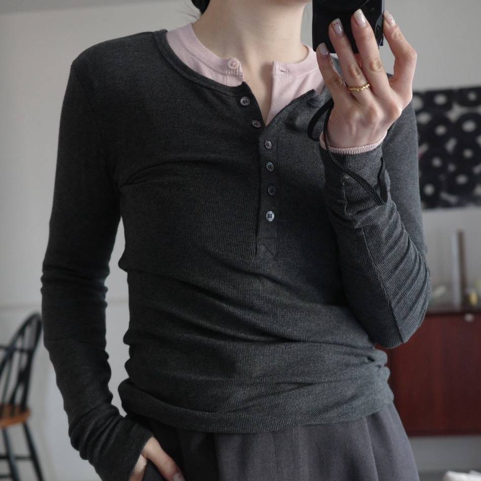 ピンクトップスにグレートップスを重ねたレイヤードは、甘さと落ち着きを両立する大人の配色バランス♡