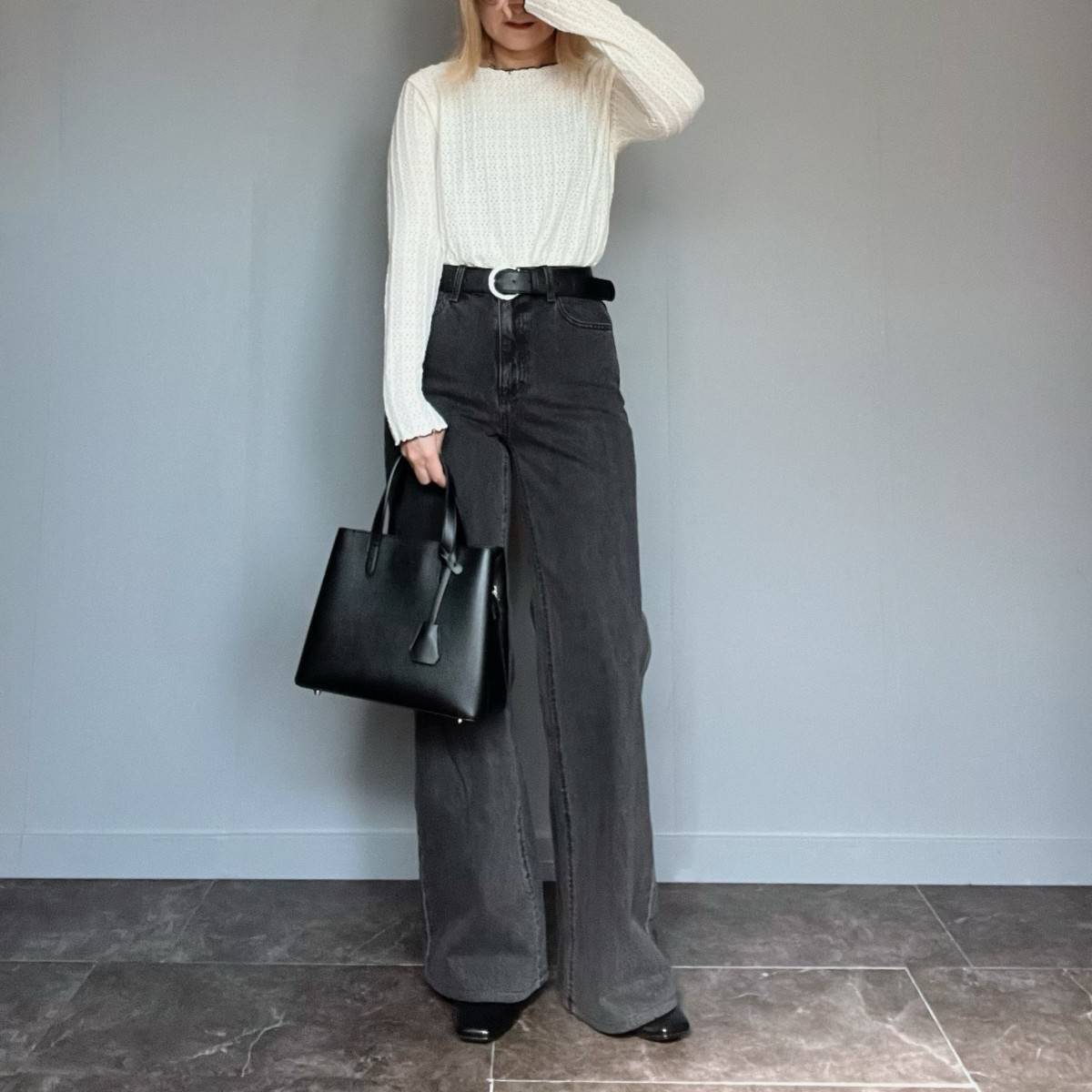 ワイドシルエットが今っぽいデニムパンツは、黒を選ぶと大人っぽい印象に♪