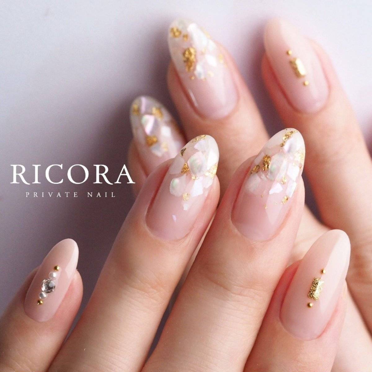 【3月編】おすすめのヌーディーベージュネイル▶︎爪の先端にシェルを埋めて華やかに