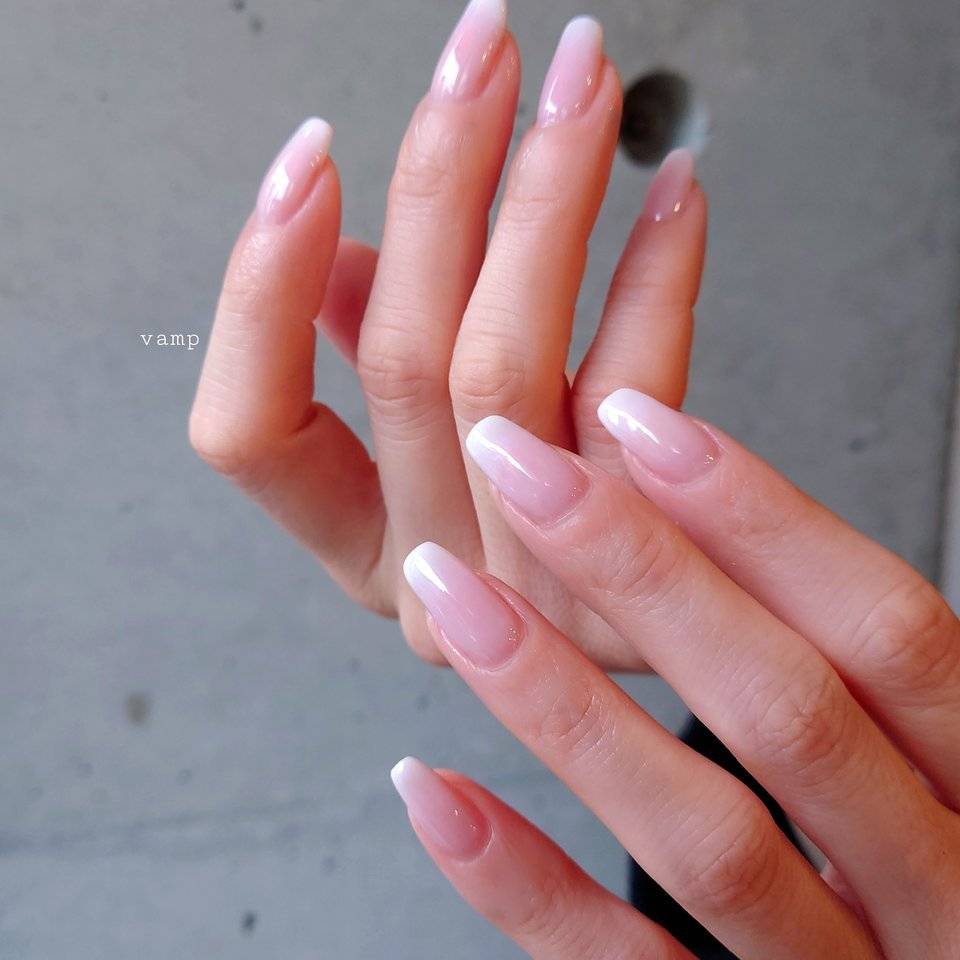 爪の先端を濃くしたグラデーションネイルは、手元がきれいに見えるベビーピンクの定番デザインです。