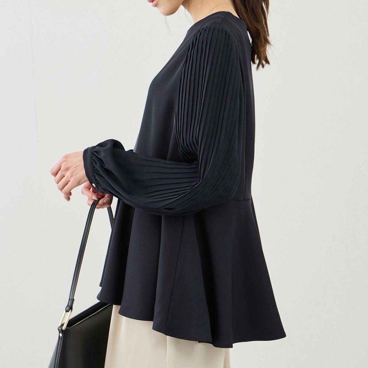 プリーツデザインのブラウストップスは、縦のラインを強調できるので、細く見えるんです!