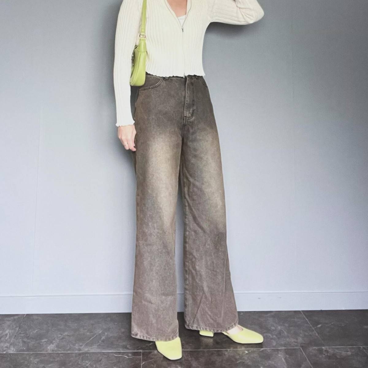 ワイドシルエットが今っぽいデニムパンツは、淡いブルーを選ぶと春らしい印象に♡