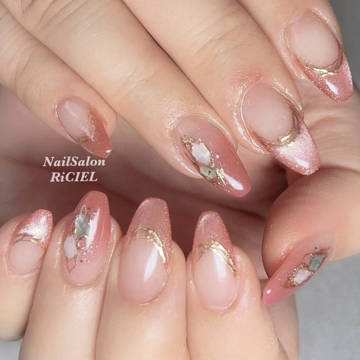 淡いオレンジピンクと乳白色のミックスは、柔らかさや上品さを叶えてくれる組み合わせ♡