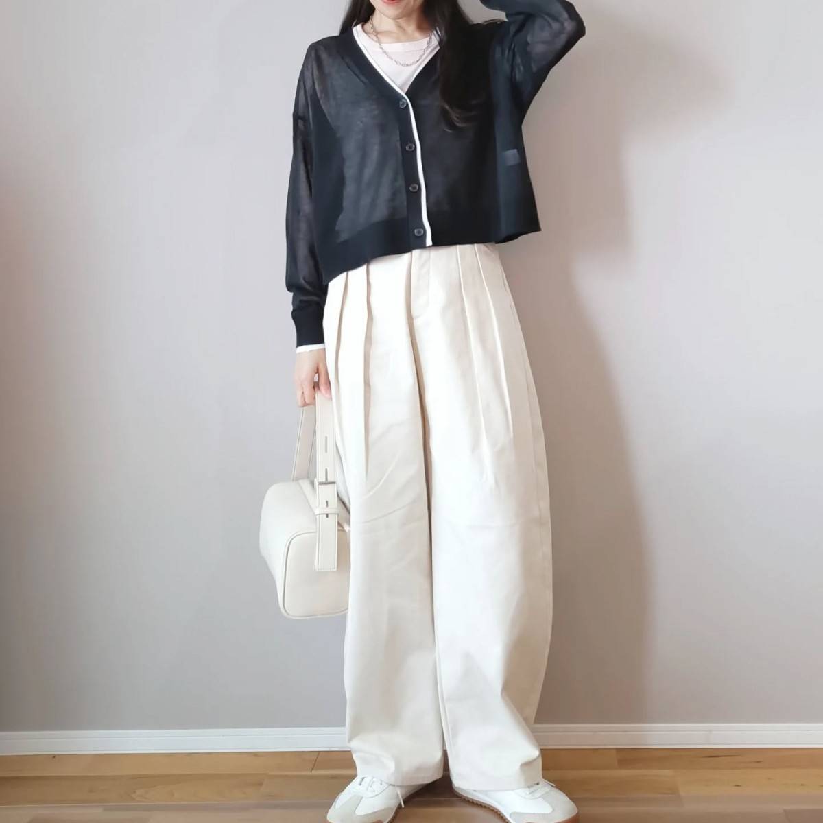 【3月編】老け見えしないワイドパンツコーデ⑤シアー素材のカーディガンで抜け感をプラスする!
