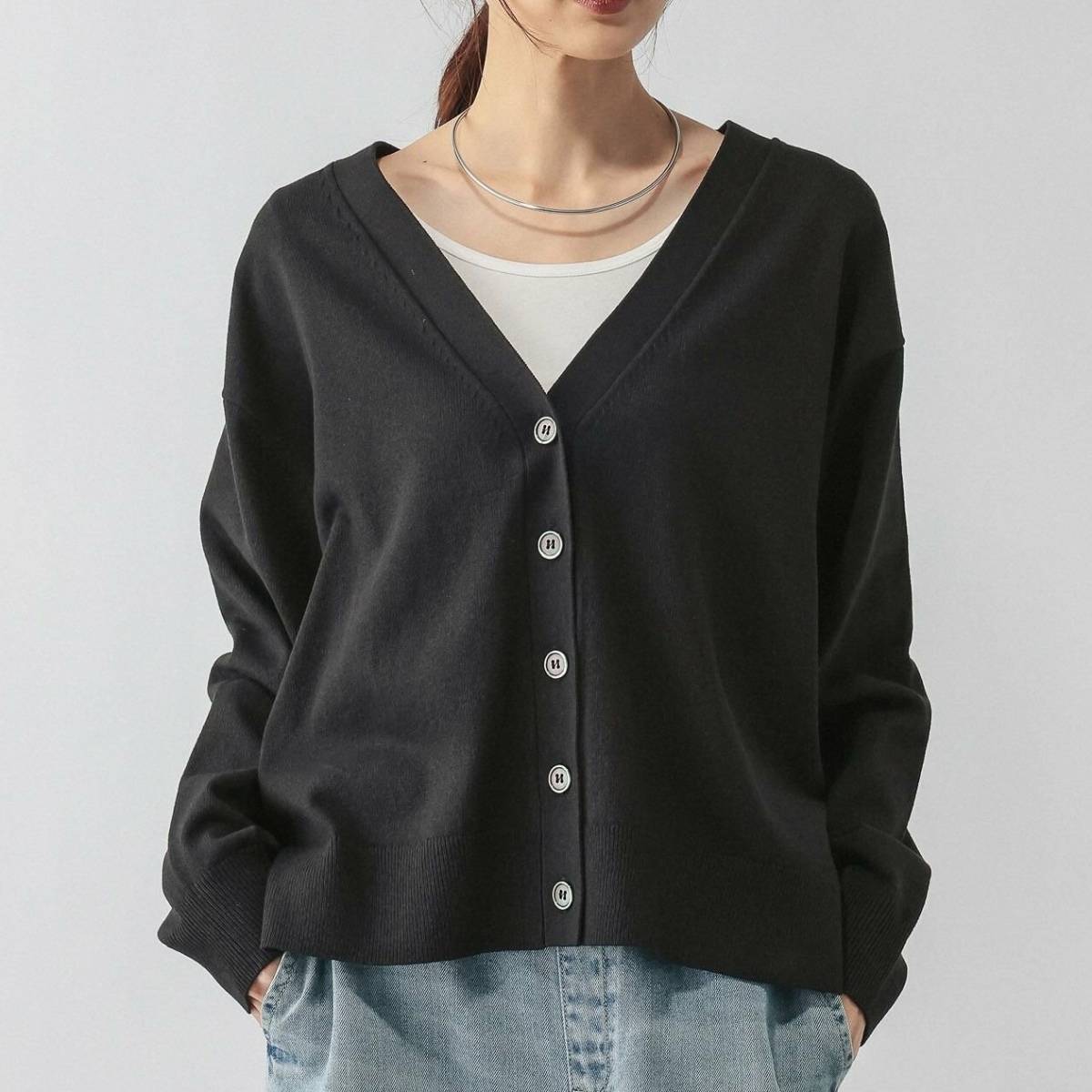 深めVネックデザインのカーディガンは、顔まわりがすっきり見えます。