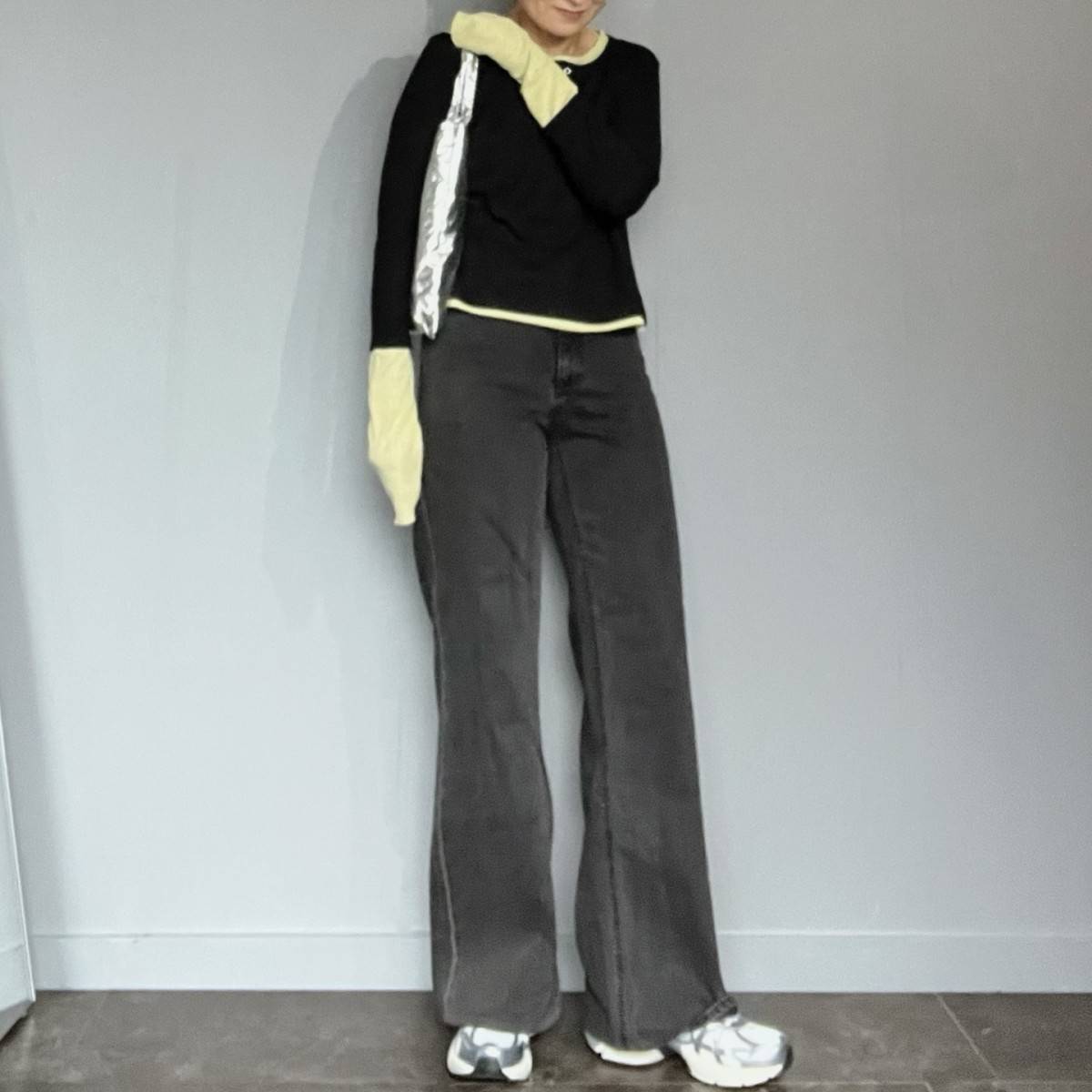 黒の長袖トップスとデニムパンツを合わせたブラックコーデは大人カジュアルな印象でおしゃれですが、春には重たく見えることも……。