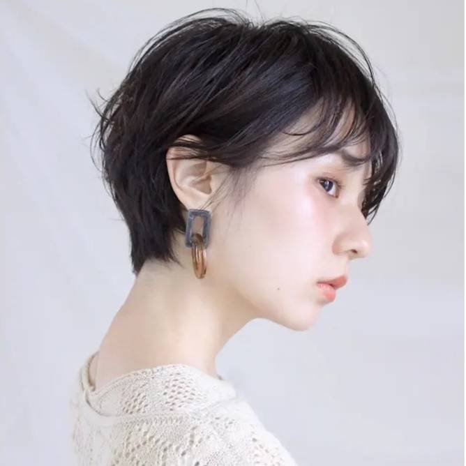 老け顔さんは丸みのある重めのショートヘアにすると、頭の形が小さく見えて◎