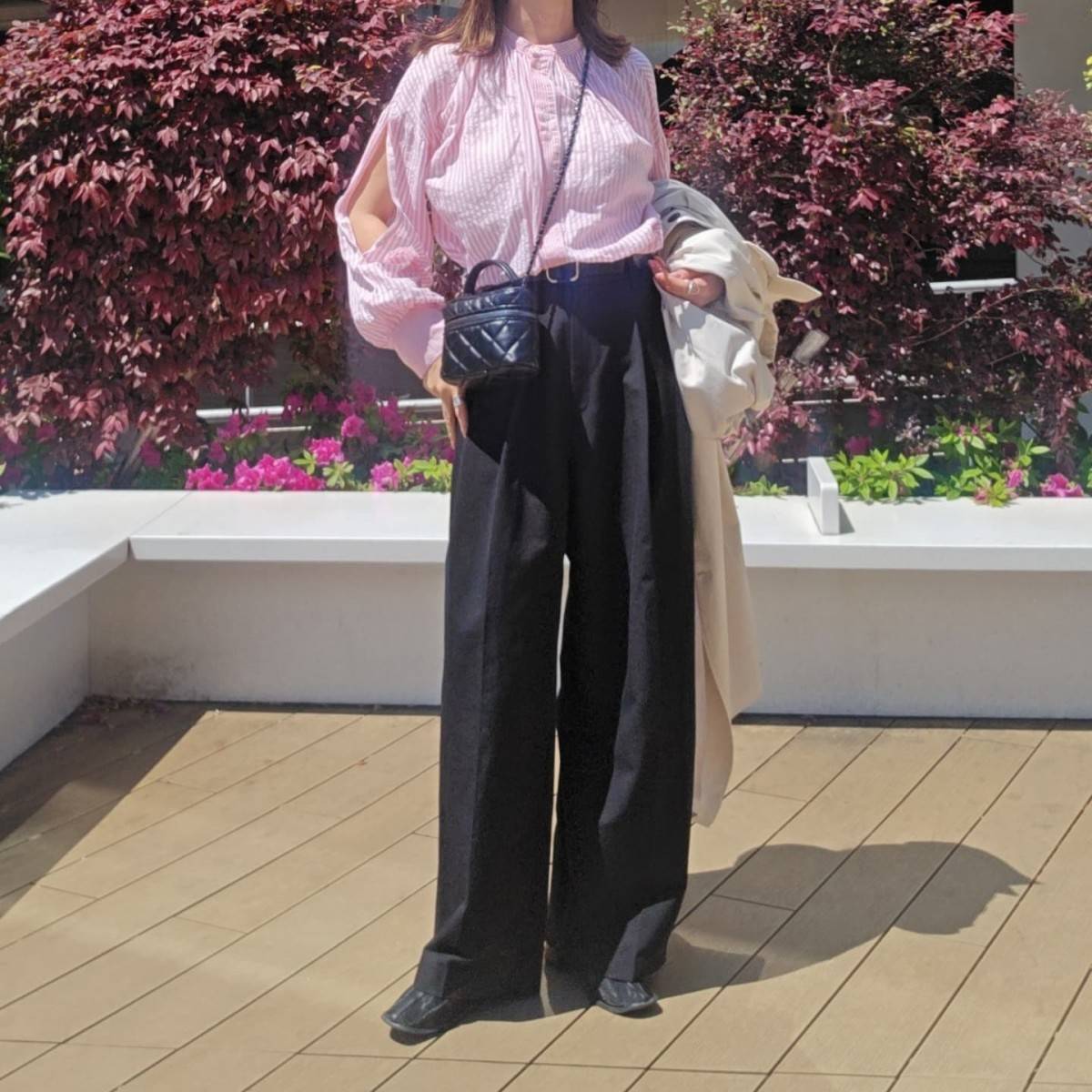 ピンクのブラウスとワイドシルエットの黒パンツは程よくきれいめで、春のおでかけにピッタリ!