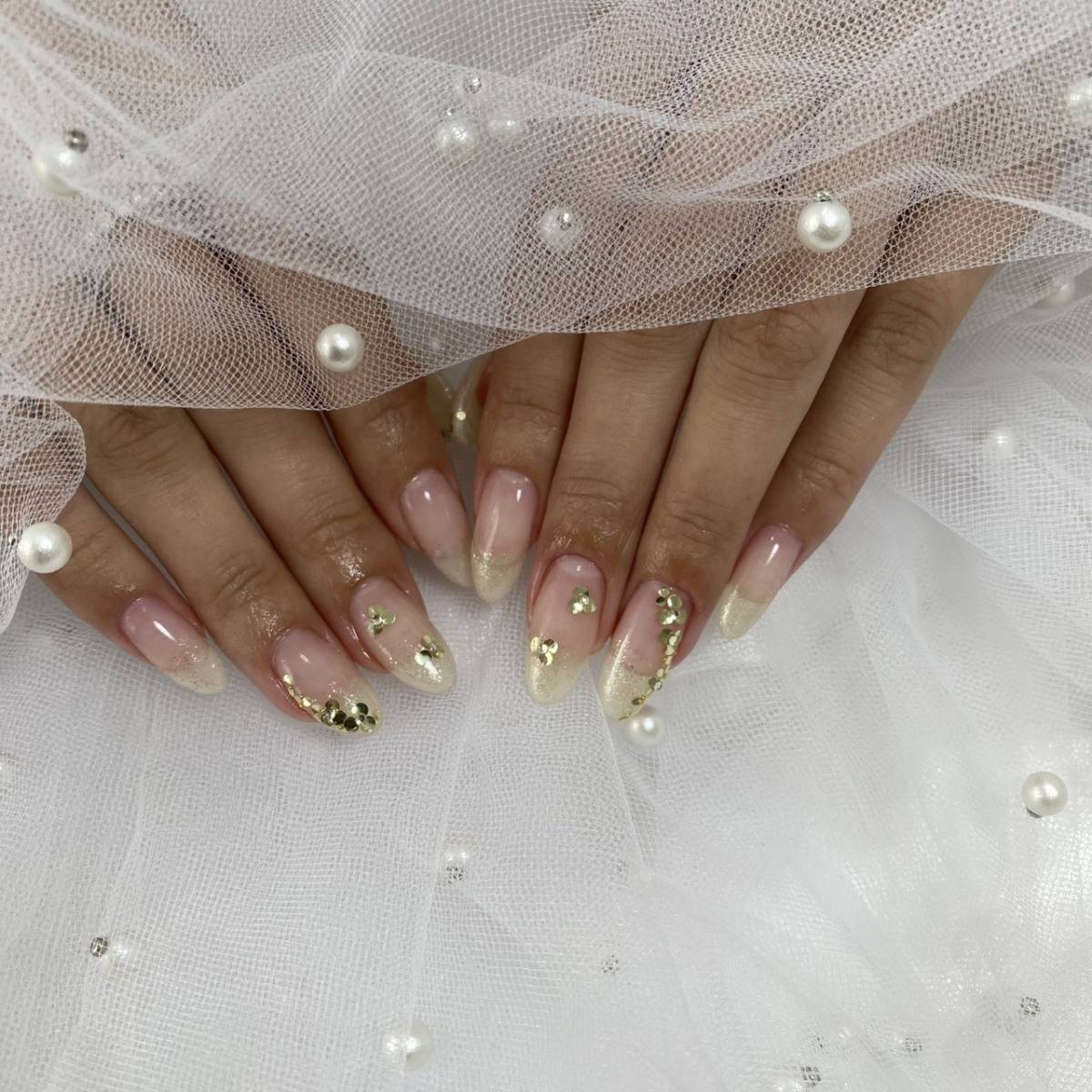 ラメグラデーションにたくさんのパーツをのせた、シンプルだけどおしゃれな大人ネイル✨