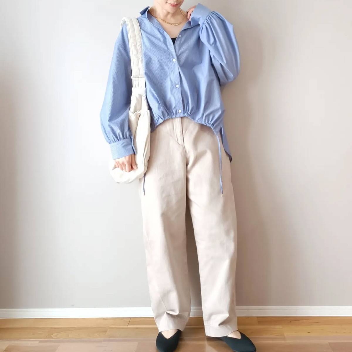 着るだけで春らしさを感じるブルーのシャツは、裾がドロストになったデザインを選ぶと◎