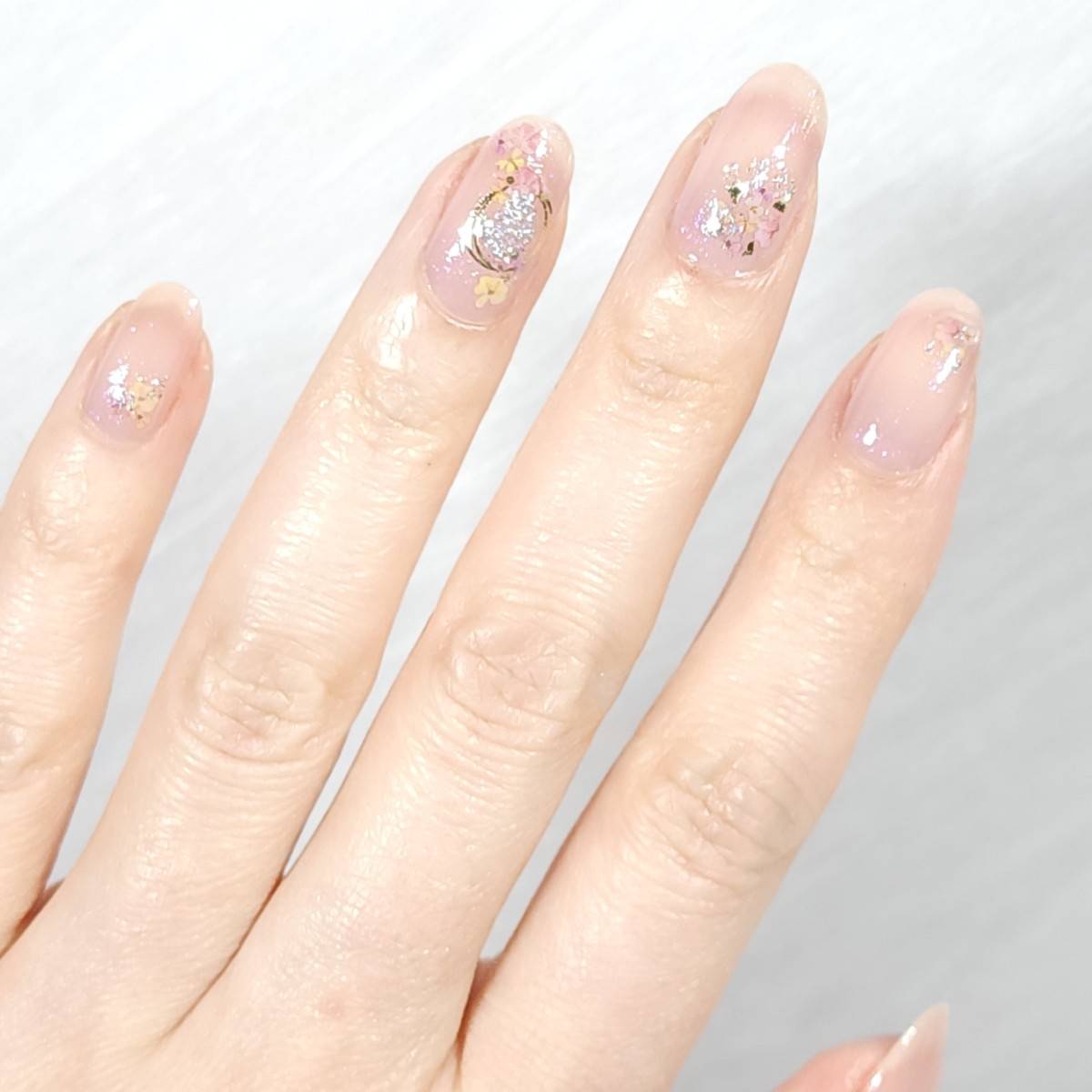 大人なシアーカラーを使って、小花とグリッターを添えた「スプリングフラワーネイル」の完成です。