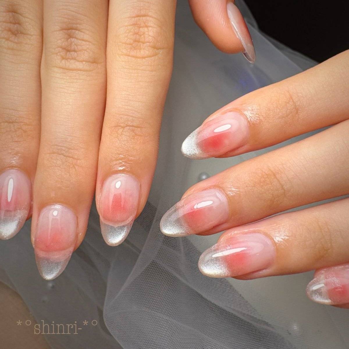 クリアピンクをベースに、マグネットのグラデーションネイルを重ねて、今っぽくアップデートしましょう。