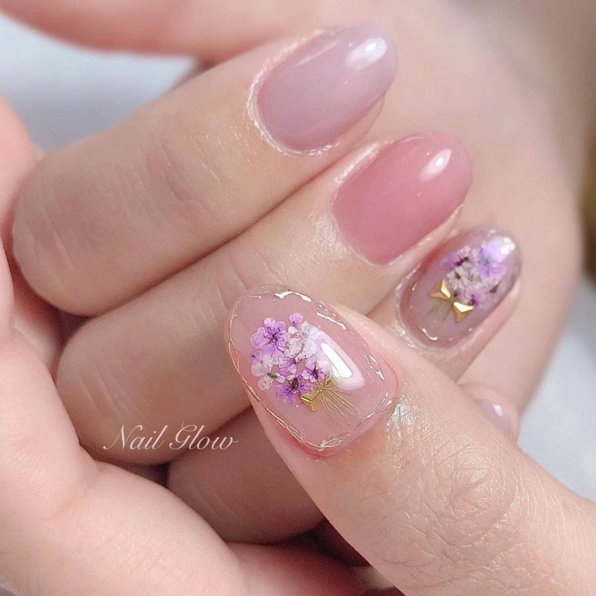 透明感を活かして、ドライフラワーで作った花束ネイルをプラスすると華やかでおしゃれです♡