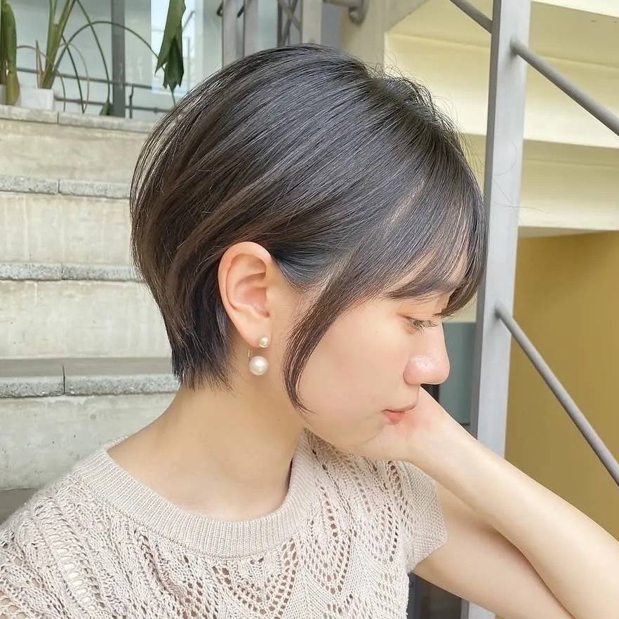 前下がりシルエットのショートヘアは、輪郭をすっきりと見せることができ、自然な小顔見えが叶います。