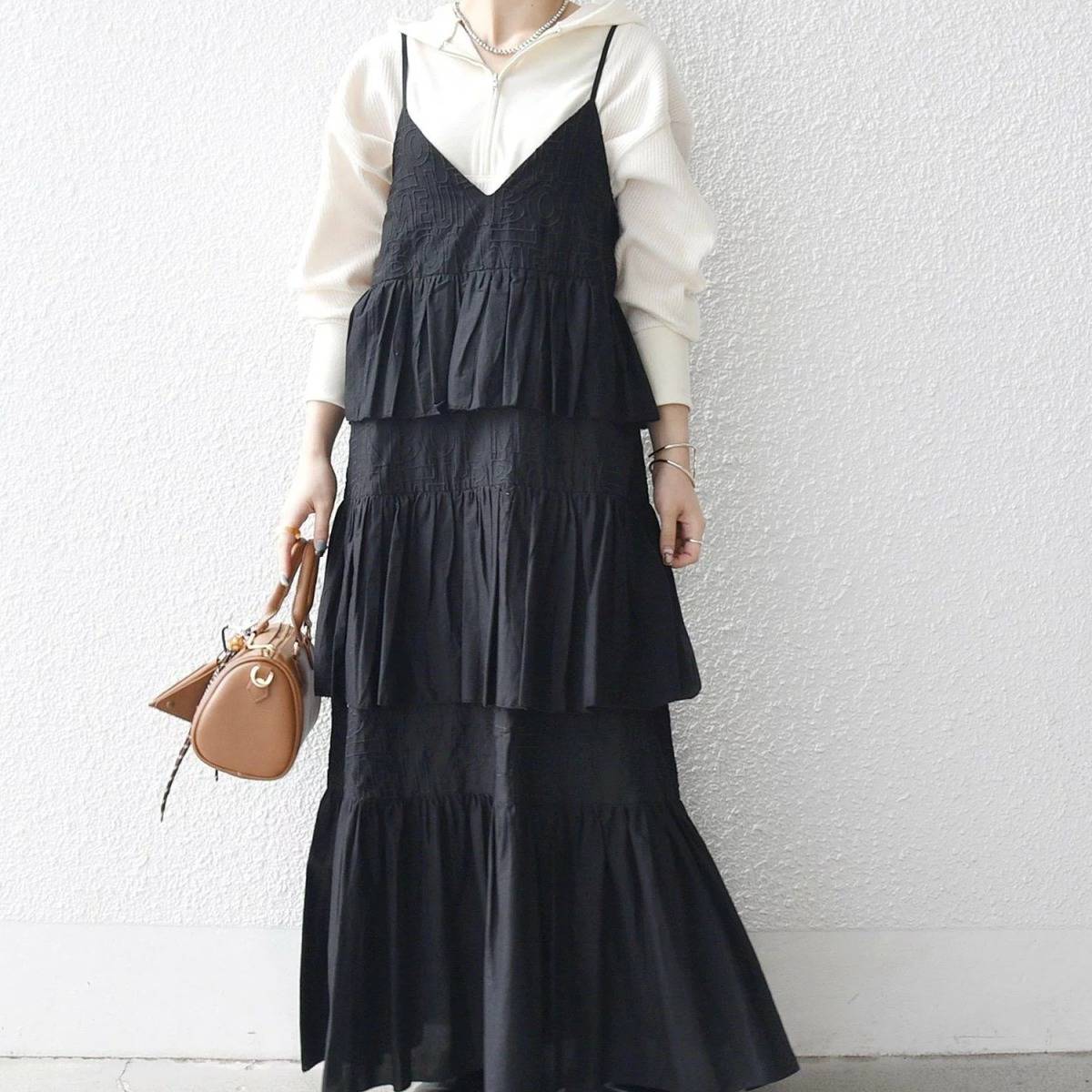 腰回りやお尻をふんわりとカバーすることができる、ティアードデザインのワンピース。