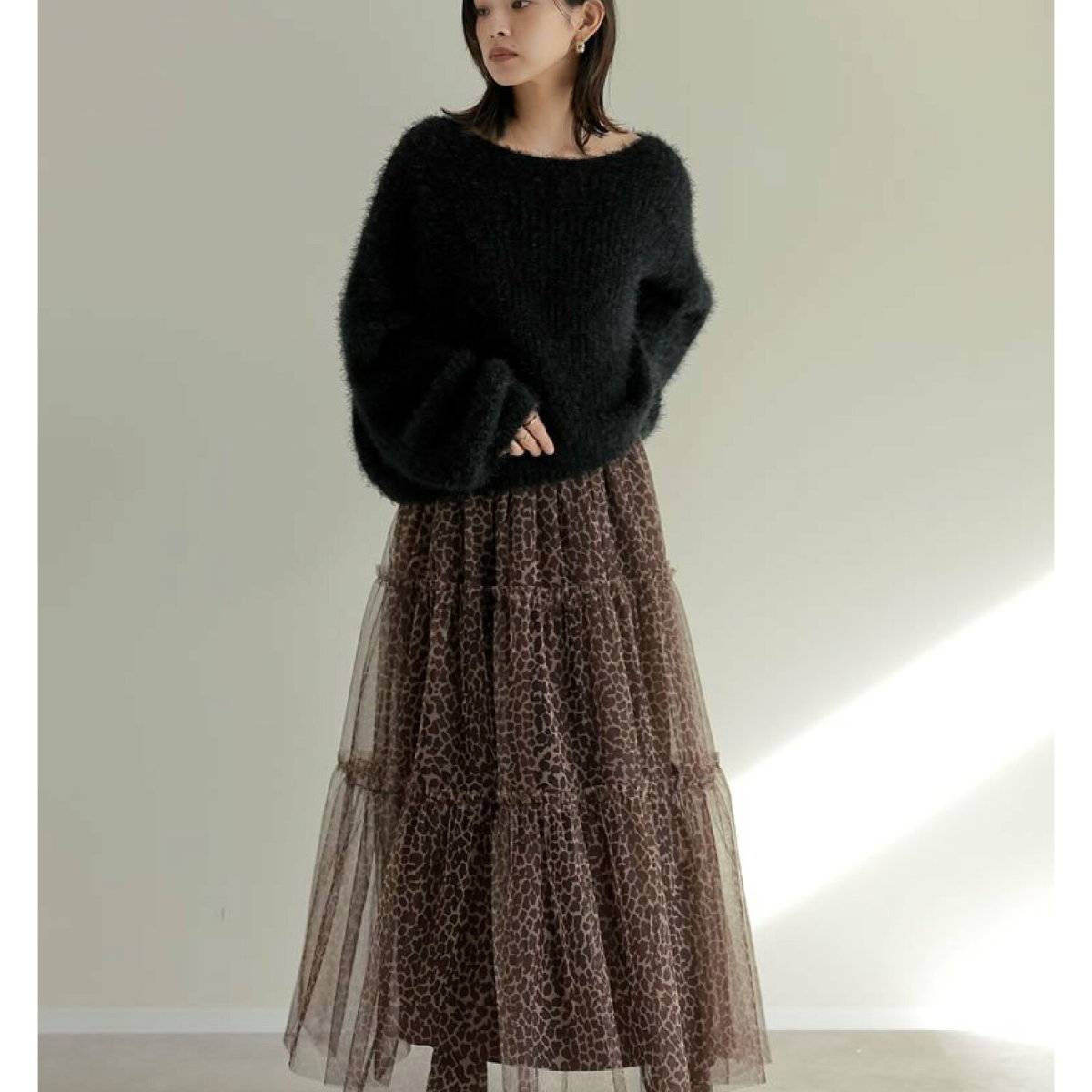 アニマル柄のスカートを使った大人可愛いコーデ⑩ブラックでスタイリッシュに