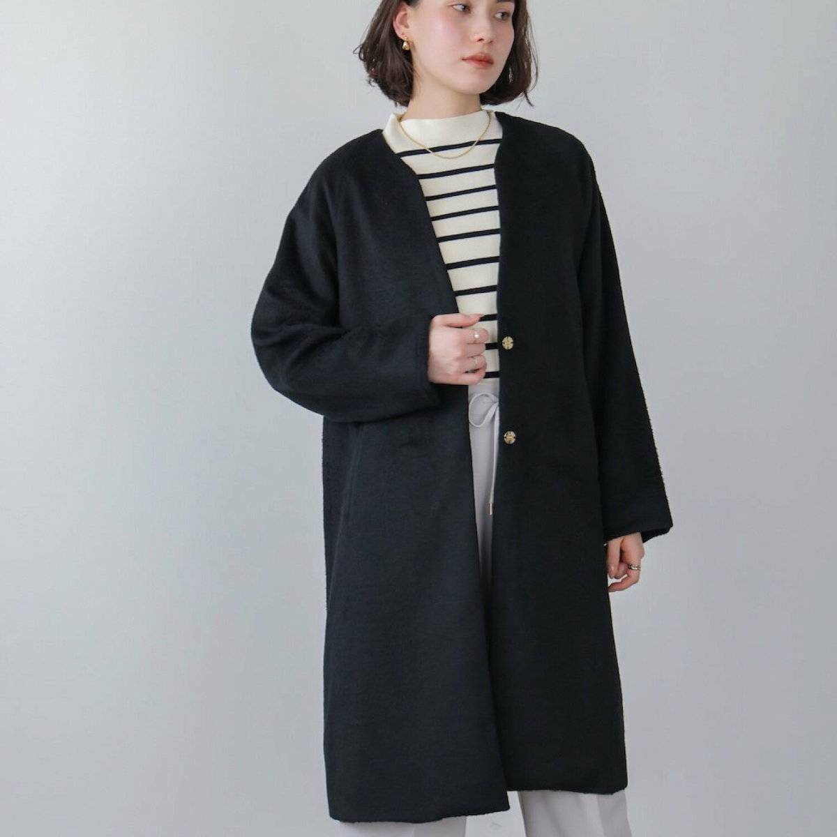 すっきりとした印象で抜け感のある着こなしに仕上げたいのであれば、Vネックやノーカラーコートを選ぶのが正解です。