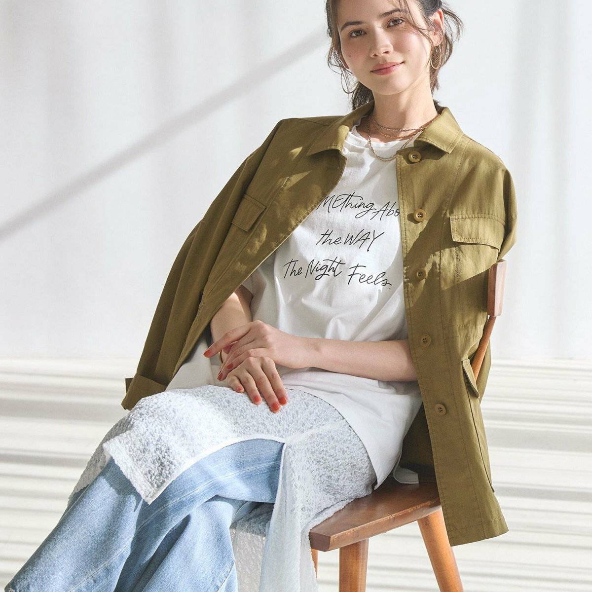 また、オーバー長袖シャツをカーディガンのように羽織ることで、スッキリとした印象を与えながらも、急激な気温変化に対応することができる服装です♪