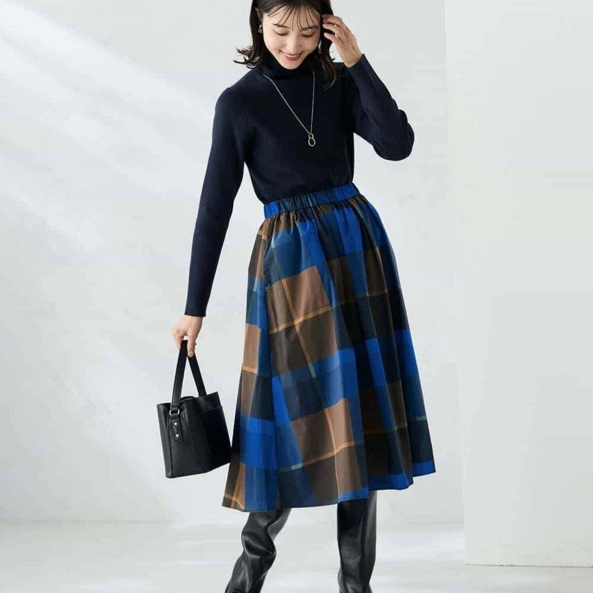ネイビーのタートルネック冬コーデ⑪チェックスカートでフェミニンに