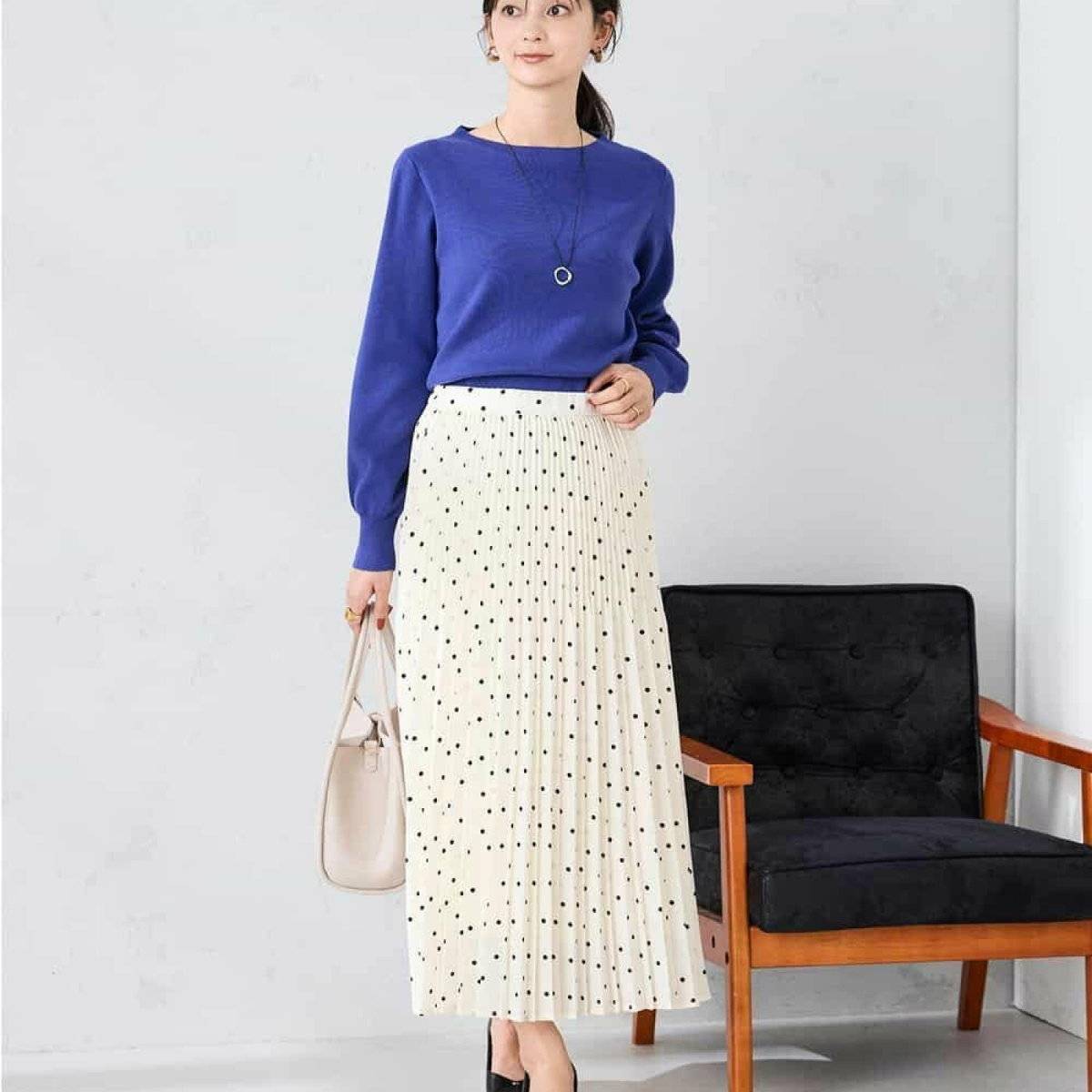 写真のような春らしく爽やかなブルーのトップスも、白のドットスカートを合わせれば上品な印象に仕上がりますよね。