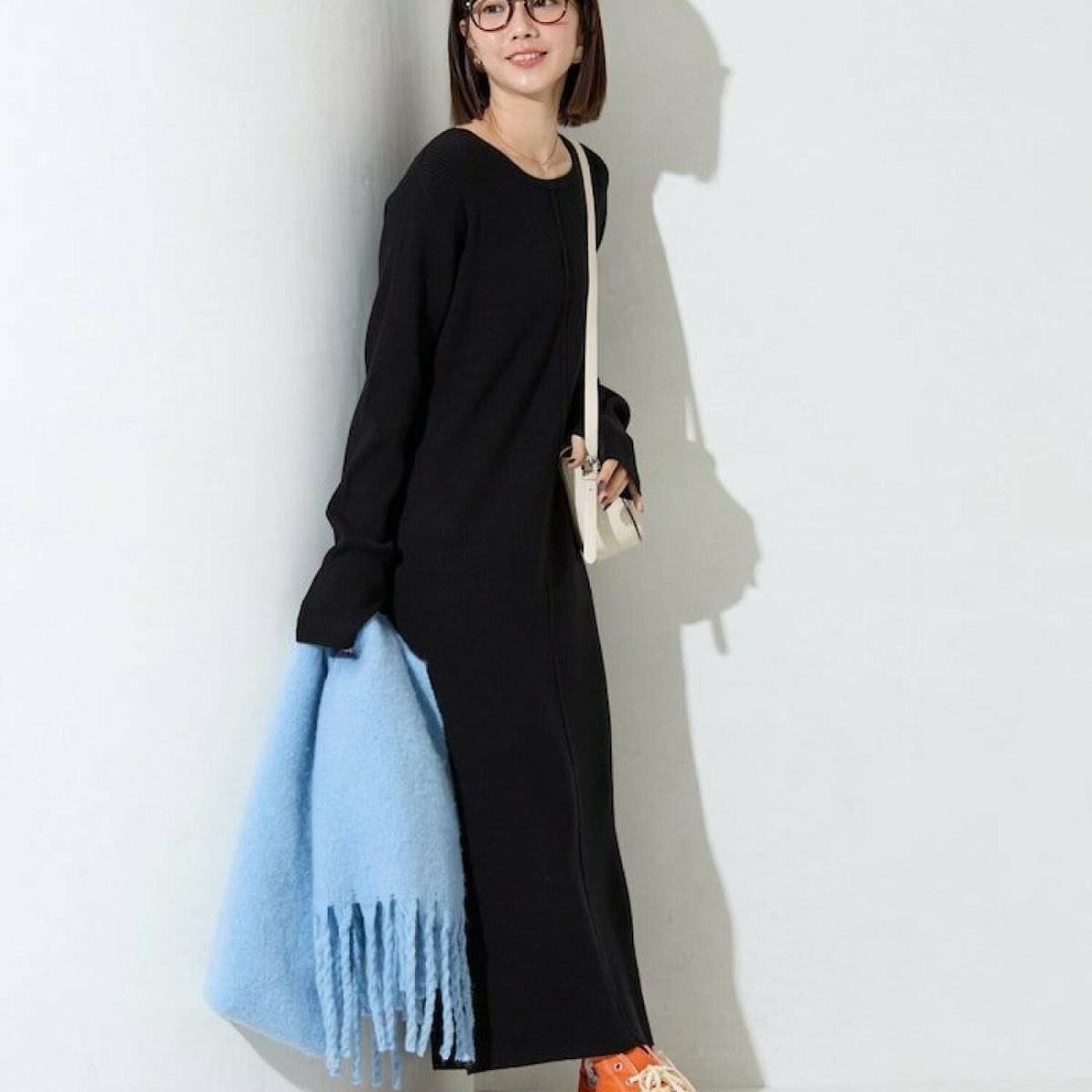 女っぽさを演出できる、黒のリブニットワンピースに、ブルーのストールを加えたコーデ!